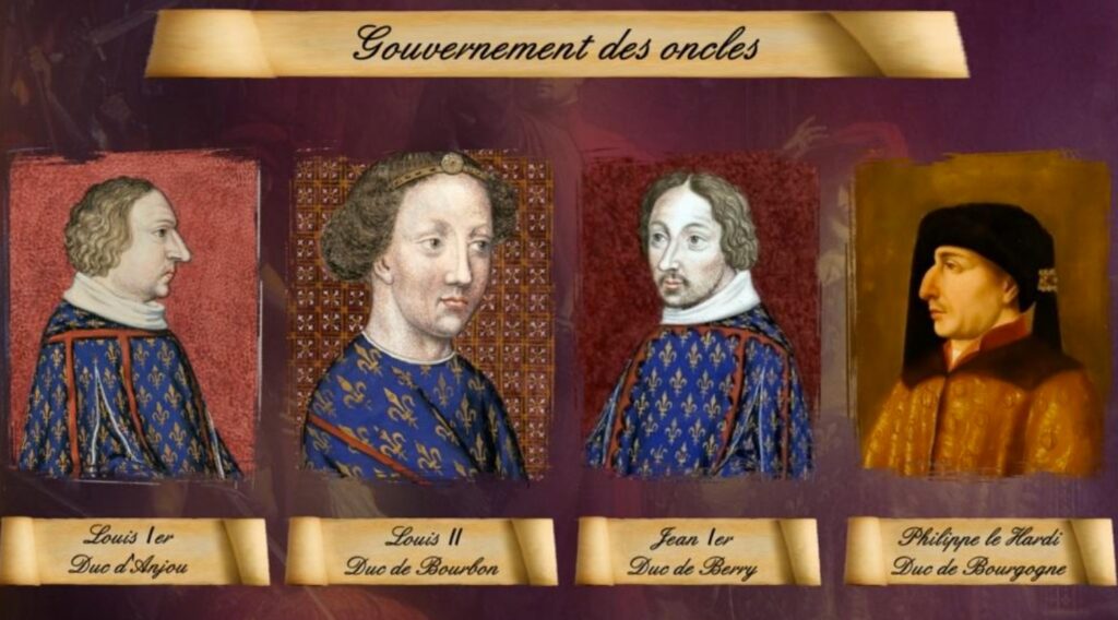 Profitant de la crise de folie, les oncles du roi — Philippe le Hardi, Jean Ier duc de Berry, et Louis Ier duc d’Anjou, du côté paternel, ainsi que Louis II de Bourbon, oncle favori du roi du côté maternel — reprennent le contrôle du gouvernement. Ils évincent les Marmousets, conseillers loyaux du souverain, parmi lesquels se trouvait notamment Clisson.